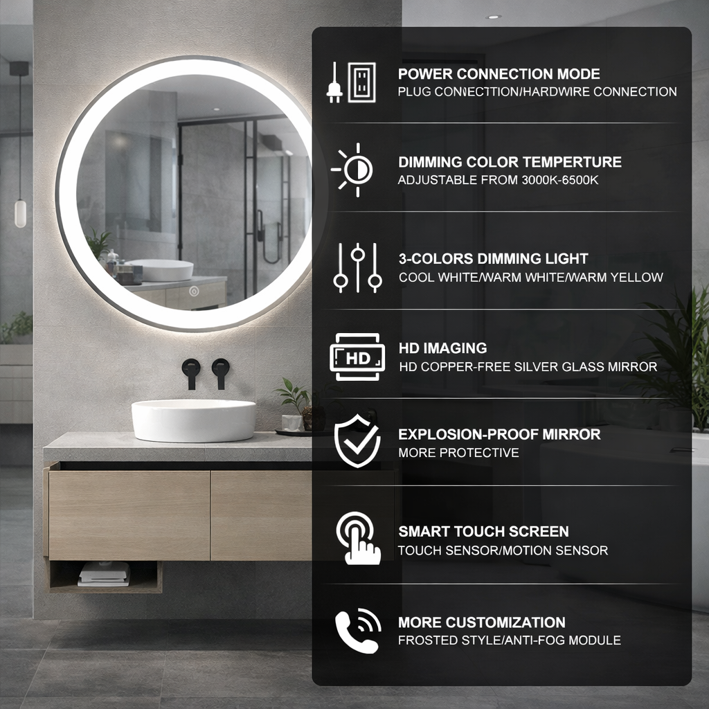 Consist of LED light stripe, defogger, clock, music player, etc., LED vanity mirror is ideal solution for both hotel and home bathroom. We can customize the mirror as per your requirements: different size, shape, function and different frames, etc
