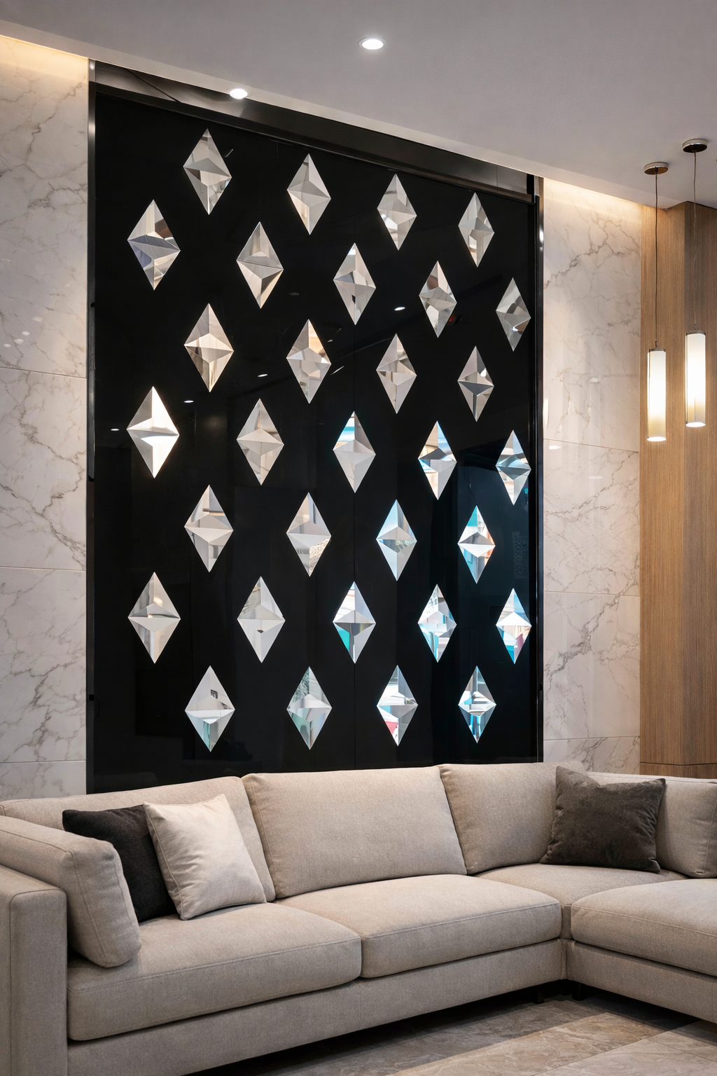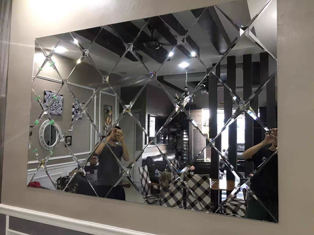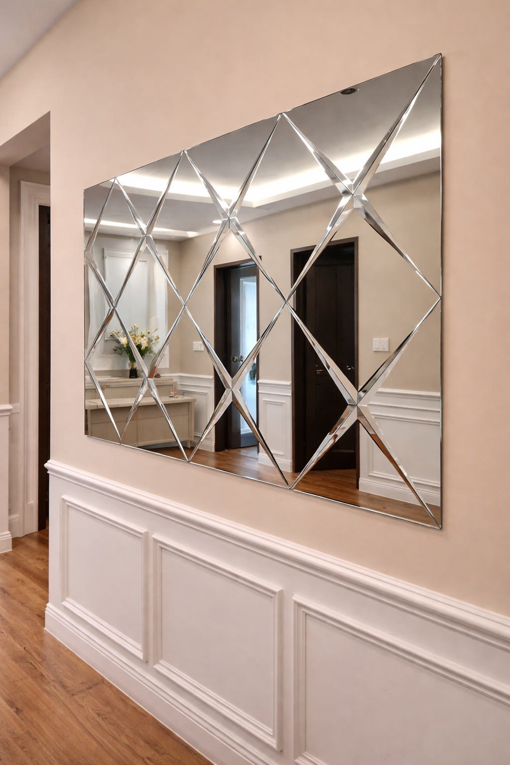 Our diamond effect beveled mirror wall panels are crafted by joining multiple precision-cut beveled mirrors into elegant geometric designs. When installed on walls, they create a striking decorative surface that reflects light and adds both brightness and depth to interiors. Each piece is polished, durable, and designed for seamless wall mounting, making it an ideal solution for luxury residential and commercial spaces. Size and shape can be customized.