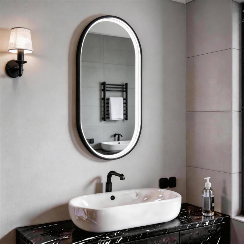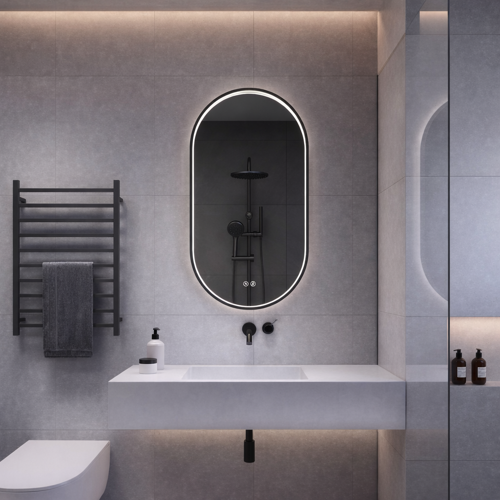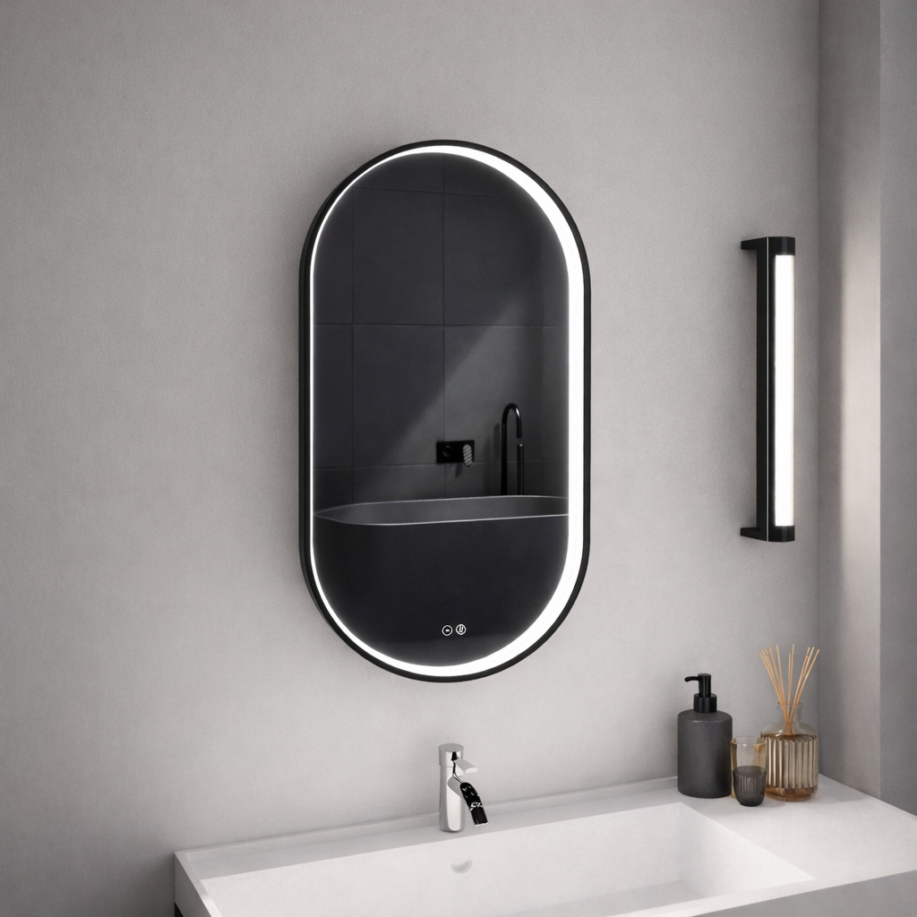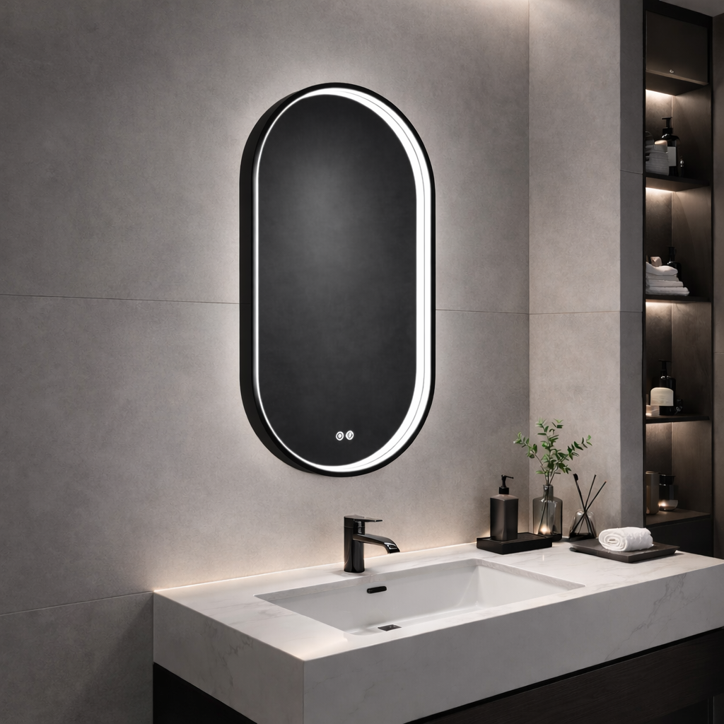 Unlike conventional front-lit LED bathroom mirrors, VEROLA features a waterproof LED light strip seamlessly integrated between the aluminum frame and mirror surface.