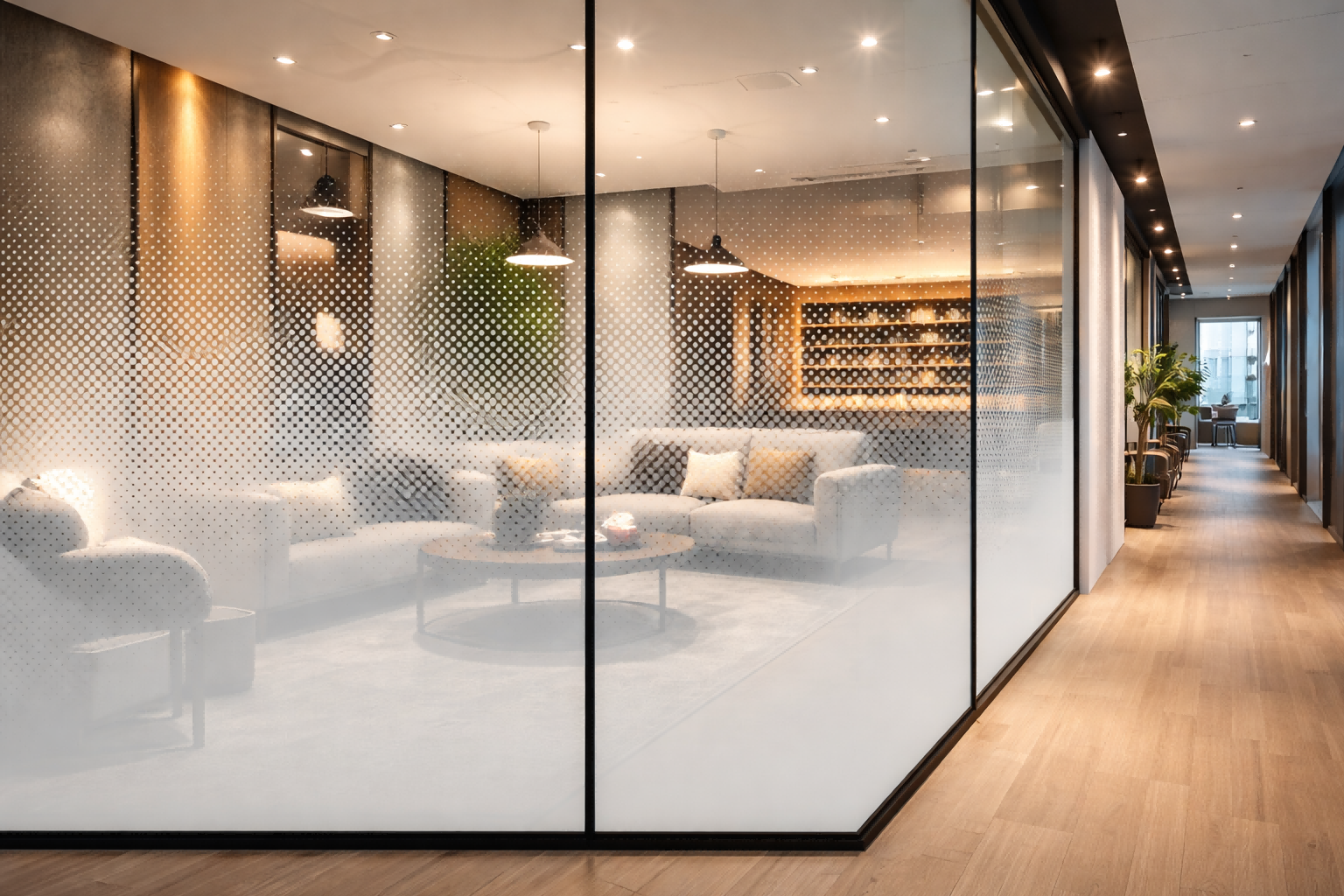 Safety reinforced wired glass with embedded steel mesh is widely specified for office partitions, hotel interiors, retail environments and reception areas. The visible wire pattern provides partial privacy and architectural character while maintaining structural safety and light transmission.