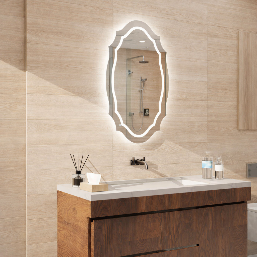 When turned off, the mirror’s frameless, oval irregular outline hides in plain sight, maintaining a clean and minimalist look that suits both modern and traditional interiors.